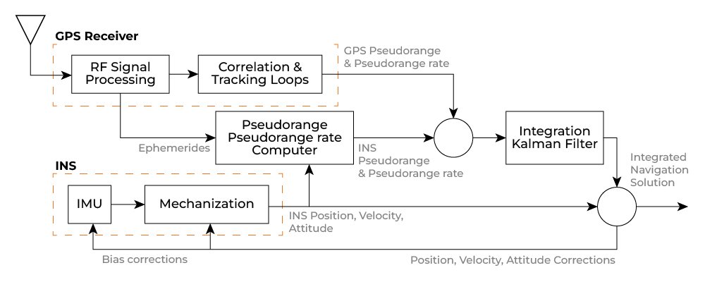 Tightly Coupled is a variant of the INS architecture that uses a standard Kalman filter to estimate INS errors, Figure 2. “The difference between the pseudo-range and pseudo-range rate measurements from the GPS and corresponding values predicted by the INS are fed to the KF to estimate the errors in the INS. The output from the INS is then corrected for these errors to obtain the integrated navigation solution. It is possible to use either pseudo-range or pseudo-range rate measurements, but often both are used because they are complementary.” [6].