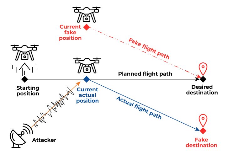 Signal spoofing. This deceives the GNSS receiver by transmitting fake signals that imitate accurate satellite signals [16]. The attacker transmits signals that imitate natural satellites but with changed parameters, such as time or coordinates. Upon receiving such a signal, the receiver may erroneously determine its location or time, which leads to distorted or incorrect data. For example, the attacker can point the receiver to the wrong place to knock a ship or vehicle off course, Figure 11.