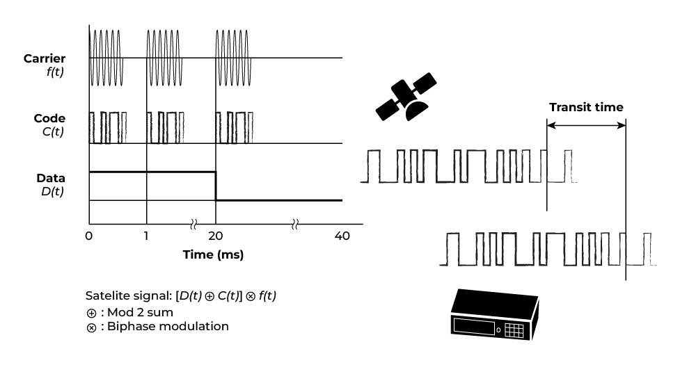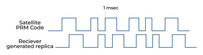 The GNSS receiver generates the same code as the satellite to determine the signal delay time and calculate the distance to the satellite. This is called pseudorandom code correlation. Each GNSS satellite transmits a unique pseudorandom code repeated at short intervals (e.g., every millisecond for GPS). The receiver has copies of these codes for each satellite and synchronizes them with the signals coming from the satellites. When the receiver receives a signal from a satellite, it matches its own generated code to the received signal, Figure 6.