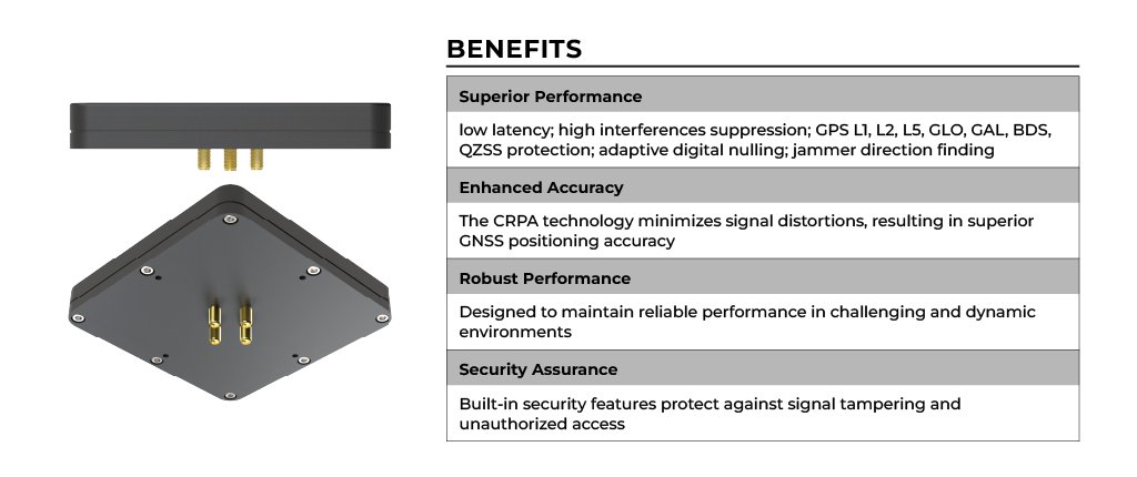 Optimized Signal Reception and Transmission Radiation Pattern Control: The CRPA technology ensures that the antenna’s radiation pattern is precisely controlled, optimizing signal reception and transmission. This allows the system to focus on desired signals while minimizing interference from unwanted sources.