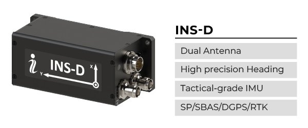 The professional model of INS utilizes an embedded, high-precision, gyro-compensated magnetic compass, which allows the navigation system to measure and output high-precision Heading without GNSS signal even in extreme environmental conditions (temperature, vibration, interference from external magnetic field).