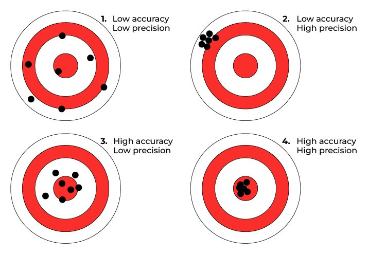 Before considering the methods and technologies for increasing the accuracy of GNSS positioning, let us dwell in more detail on the concept of precision and accuracy [14]. To understand the difference between precision and accuracy, consider Figure 8. In the first case, 1, the points are scattered throughout the target, i.e., the degree of proximity of the measured value to the actual value is very far, and the measurements have no repeatability. In the second case 2, excellent repeatability is observed, but the points are far from the center of the target, i.e., from the actual value. In the third case, points are close to the center, but there is no clustering or repeatability. Finally, in case 4, all the points are at the center of the target, with good accuracy and precision.