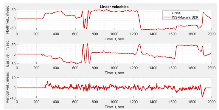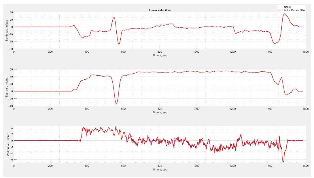 Figure 4.3 below showcases the INS’s velocity estimation derived from the absolute 3D position aiding supplied by Maxar’s Raptor SDK.