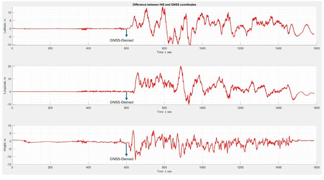 The section below shall provide performance plots on position error during the flight test duration, from the real-time results to a tightly coupled post-processed reference trajectory. The post-processed reference trajectory (ground truth) was generated using Inertial Explorer by tightly coupling raw GNSS observables, GNSS corrections using precise-point positioning, and raw IMU data collected from the reference INS systems.