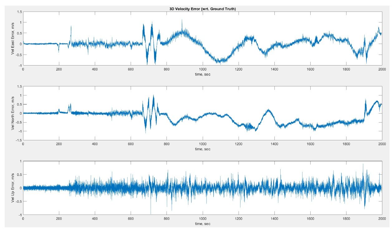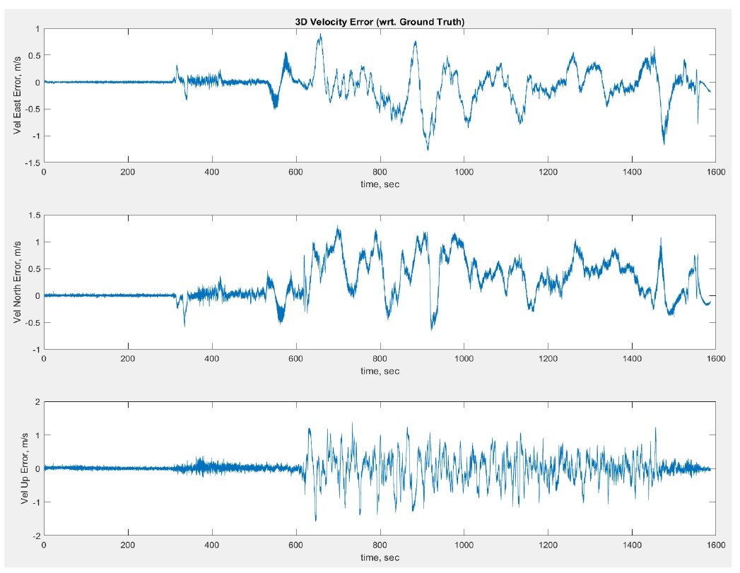 Figure 3.2 above showcases a bounded INS 3D position error of 20m during the entire flight duration. With Maxar’s Raptor software providing the INS with accurate, low-latency position estimation, the INS can maintain its drift and provide continuous positioning APNT output to a wide range of end-user platforms (i.e., flight control systems of fixed-wing and multirotor platforms). The altitude error of the flight doesn’t exceed 2m primarily due to two sources of altitude aiding: the computer vision-based position estimate and the internal barometer of the INS. Moreover, accurate position estimation allows the INS to yield precise velocity estimation throughout the flight, as exhibited in Figure 3.3 below.