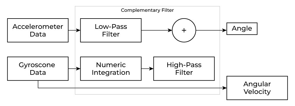 2) Complementary filter. It combines data from the accelerometer (for slow orientation changes) and the gyroscope (for fast orientation changes), which allows for compensation of errors from each sensor, Figure 3. The accelerometer provides long-term stability, and the gyroscope provides short-term accuracy [2].