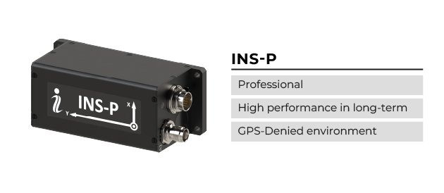 The professional model of INS, the INS-P, utilizes an embedded, high-precision, gyro-compensated magnetic compass, which allows the navigation system to measure and output high-precision Heading without GNSS signal even in extreme environmental conditions (temperature, vibration, interference from external magnetic field).