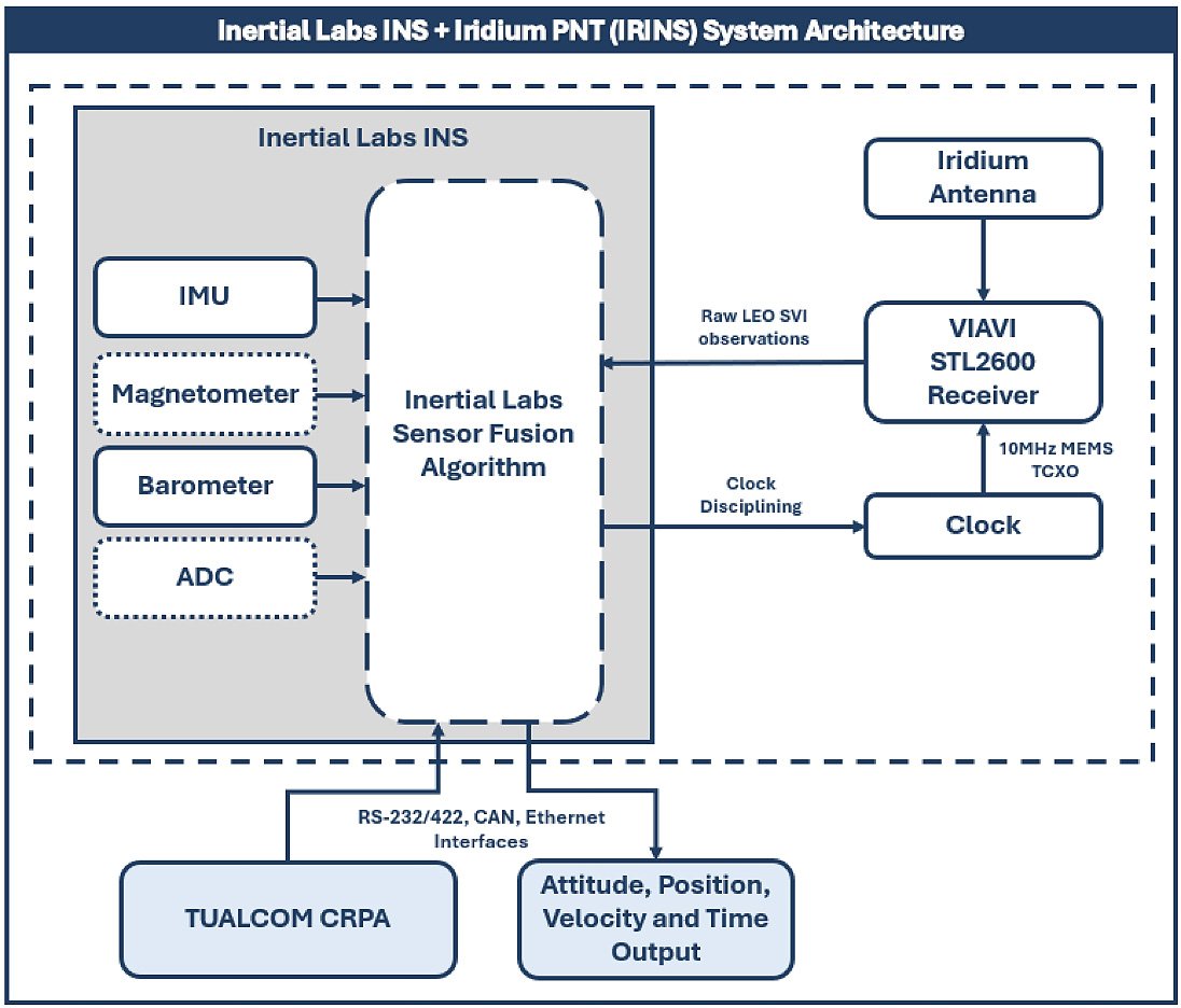 The LEO-Aided Inertial Navigation System (IRINS) is a fully integrated navigation solution combining aiding data from an Iridium Satellite Time and Location (STL) service enabled receiver with a tactical grade MEMS IMU.