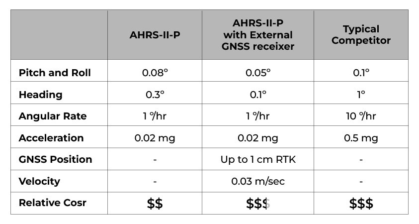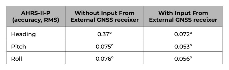 Here is A cost and functional comparison of the AHRS-II-P, AHRS-II-P with an external GNSS receiver, and a similar product from a competitor. We understand that every application has a particular set of requirements. Inertial Labs works hard to build a perfect solution for every application while ensuring the customer does not overpay. As you may see from the table, an external GNSS receiver alone would add several critical states of a system to the output. This would cover a wider variety of applications while, as you can see, still can stay at a competitive price when compared to one of its market’s competitors.