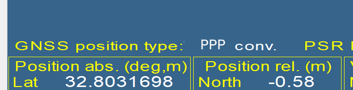 Once the TerraStar message is received, the “GNSS position type” of INS solution changes to “PPP conv” during the convergence or to “PPP” when converged. This means, that the GNSS receiver has TerraStar activated and TerraStar correction will be used at next INS operations.