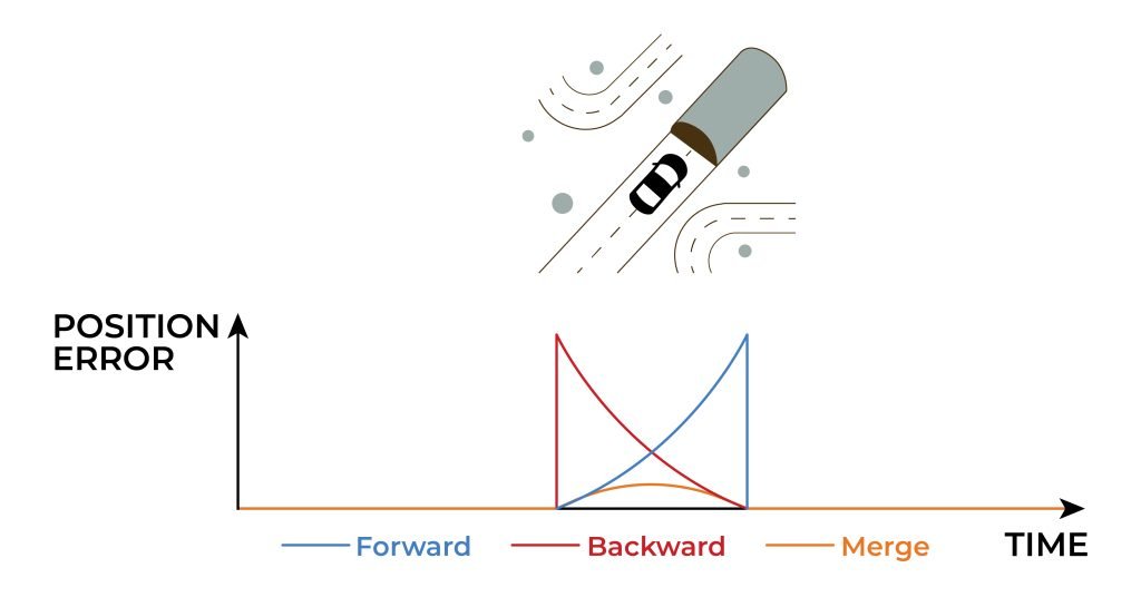 The principle of data processing during post-processing is straightforward. Look at Figure 1 shows the positioning accuracy depending on time. Let’s assume that half of the way, the car was driving in open terrain, and there was good visibility of satellites. Accordingly, the positioning error is minimal. Then, halfway through, the car went into a tunnel without a satellite signal. The positioning error began to increase, and after leaving the tunnel, it again became close to zero.